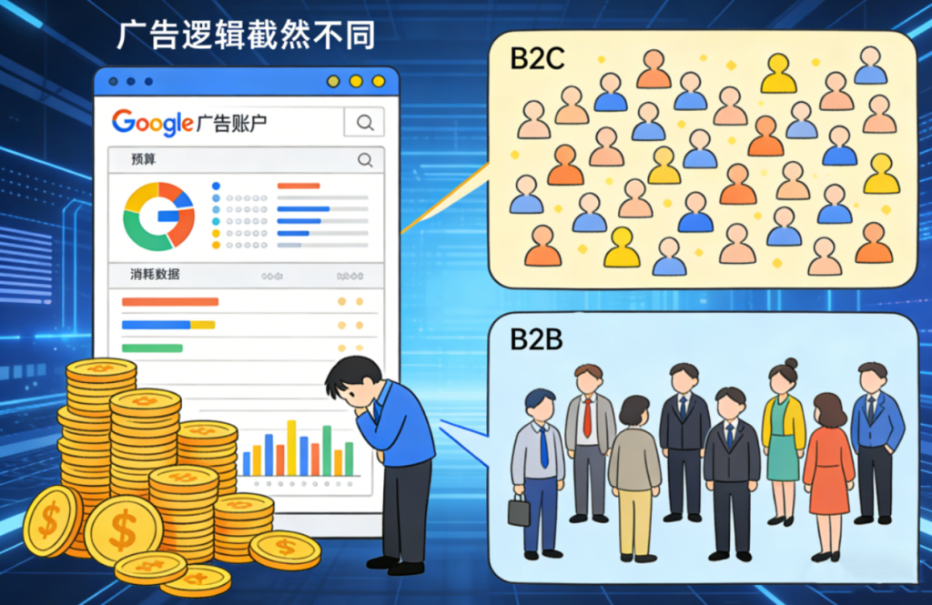 经过大量项目复盘,我们发现问题的根源往往不在于投放技巧本身,而在于一个根本性的认知错位——将B2B的广告逻辑,套用在了B2C的流量思维里。