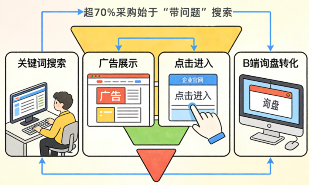 B2B搜索广告的本质,不是技巧层面的博弈,而是围绕真实采购行为构建的获客基础设施。从需求识别、信息传递、线索转化到销售协同,每个环节都影响着最终的获客效率。