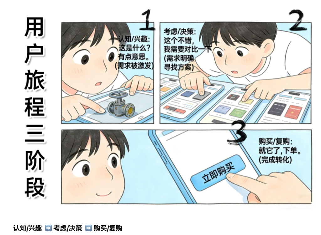 第一次看到你的广告:哦,这家是做工业阀门的。第二次看到:哎,又刷到他们了,好像规模不小。第三次看到:点进去看看,原来工厂在江苏,做了十几年了。第四次:他们有个新工艺,好像挺有意思,留个邮箱下载个资料看看。第五次:正好最近有采购需求,发个询盘问问价。