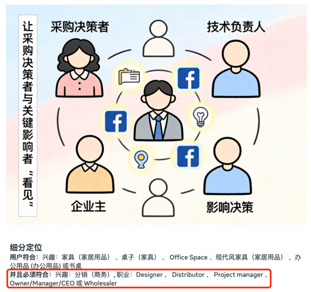 那些没有接触过你,但职位和企业属性匹配的人——锁定“采购经理”“企业主”“运营总监”等职位,加上行业限制,再叠加一些相关的兴趣行为(比如关注过行业媒体、参加过展会)。给他们看实力证明类的内容,让建立信任。